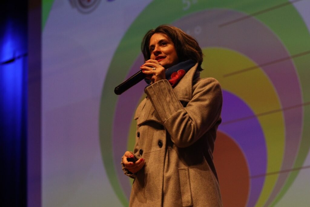 Débora Noal durante sua participação no Conbrascc, onde conduziu a palestra “Intervenção psicológica em catástrofes: abordagens práticas no primeiro acolhimento emocional”. Foto: Ana Carolina Zago