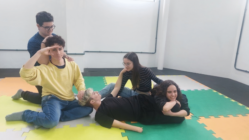 “A parceria com o Teatro foi fundamental para encontrar uma linguagem acessível para trabalhar com educação para saúde com crianças e adolescentes, tratando de temas mais sérios de um modo lúdico”, explica Dinarte. A abordagem acontece em encontros que combinam rodas de conversa e jogos teatrais, criando um espaço seguro para reflexão, expressão e movimento. Em 6 encontros de noventa minutos, alunos são convidados a pensar, sentir e se expressar corporalmente sobre temas que, muitas vezes, não encontram espaço na rotina escolar tradicional. Segundo Marina, participaram do projeto cerca de 40 alunos ao todo. “Os alunos nem sempre eram os mesmos, nas rodas. Cada roda tinha aproximadamente 20 alunos. Ela é pensada idealmente para esse número, já que a ideia é haver um espaço efetivo de troca, em roda”, afirma a professora.